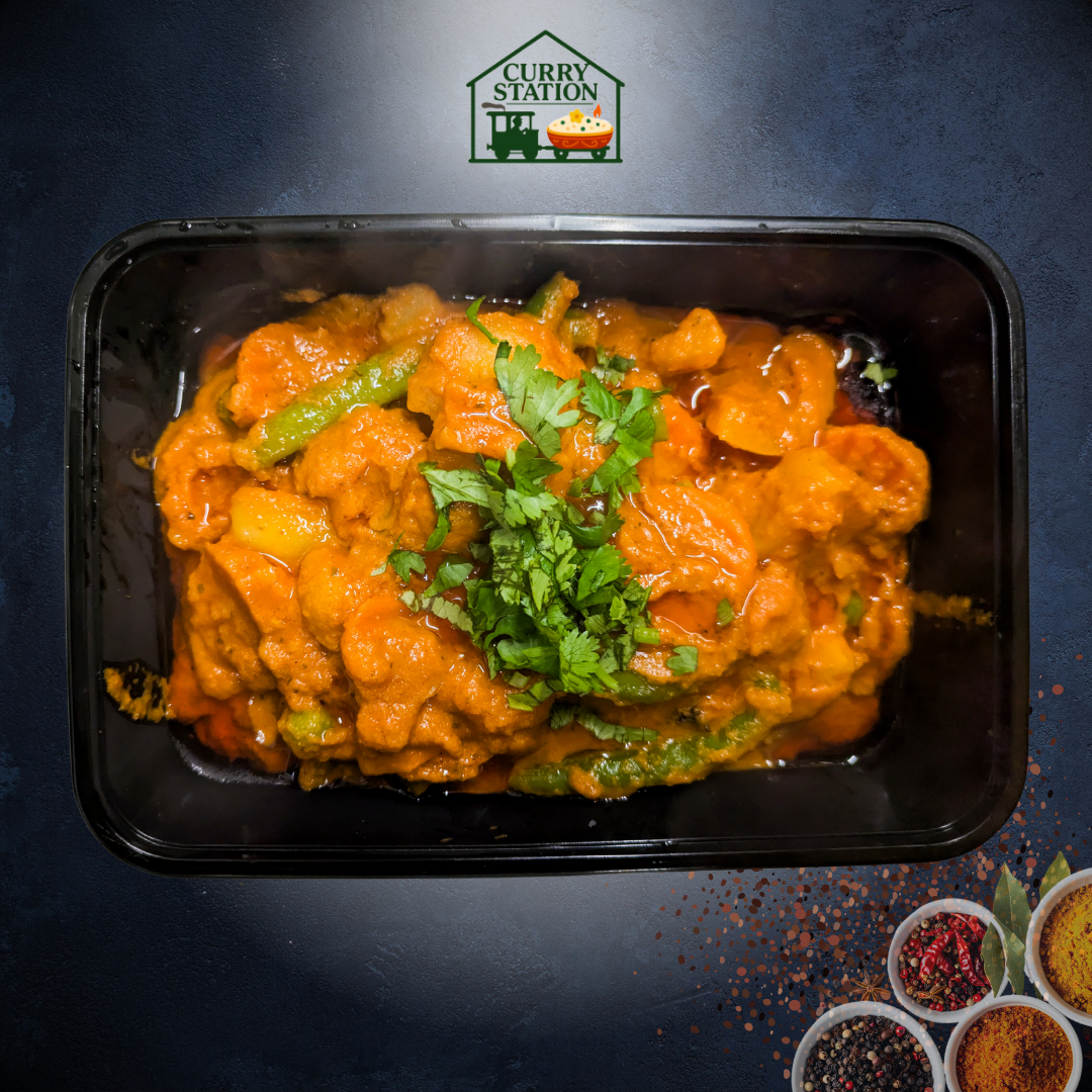Zubereitet mit saisonalem Gemüse, sanft gegart in einer cremigen Sauce aus Cashews und Tomaten serviert mit einer Portion Reis.