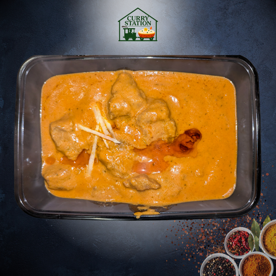 Zubereitet mit zartem Fleisch in einer sanften Rahmsauce mit feiner Kokosmilchnote serviert mit einer Portion Reis.