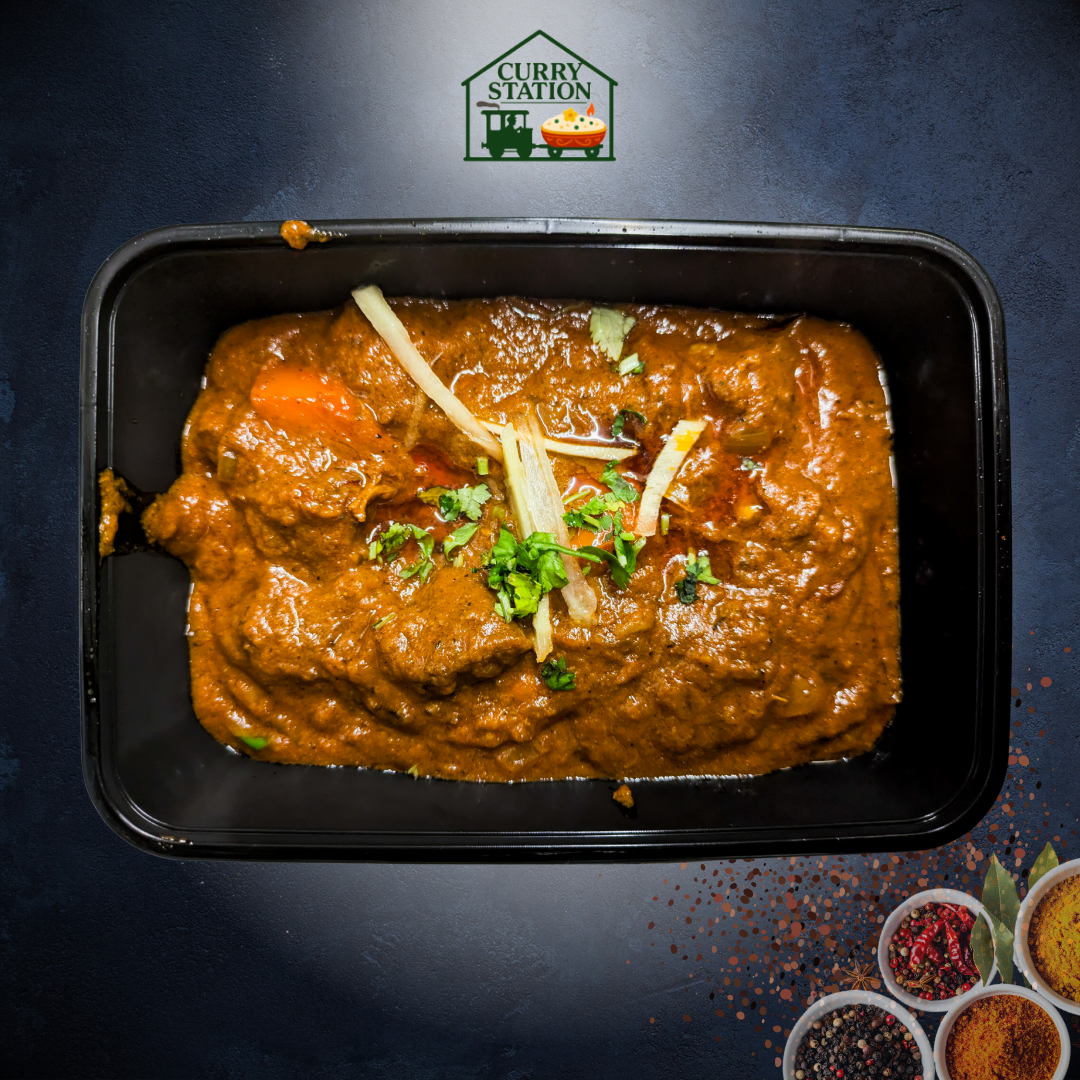 Zubereitet mit Rindfleisch und Kartoffeln nach südindischer Art – ein pikantes Curry mit intensiven Gewürzen, serviert mit Reis.